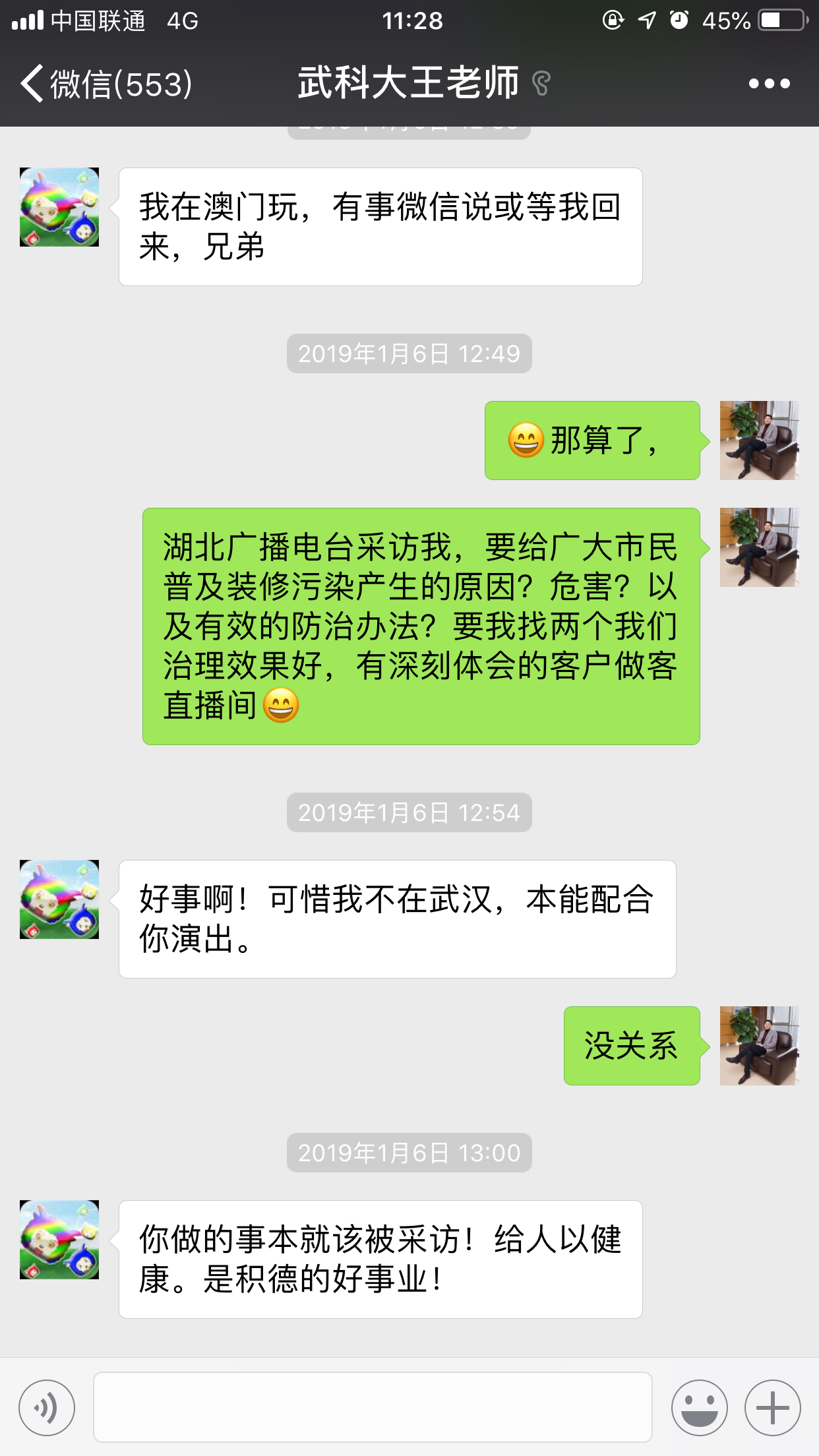 之前给武汉科技大学做过甲醛治理的王老师对我们的治理效果很满意 相关推荐: 除甲醛系列产品 除甲醛常见问题 武汉绿健君安室内甲醛检测流程 武汉绿健君安室内甲醛治理流程 湖北经视大厦甲醛治理案例 武汉农业银行室内空气净化 育才幼儿园除甲醛 摩拜单车甲醛治理 >>更多热门文章<< 上一篇:不要让祖国的花朵 成了甲醛的“试纸” 下一篇:录音棚、录音室的甲醛污染需得到重视