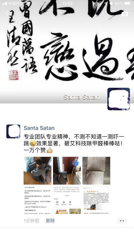 武汉绿健君安除甲醛客户因为满意我们的治理效果!特地发了一条朋友圈! 相关推荐: 除甲醛系列产品 除甲醛常见问题 武汉绿健君安室内甲醛检测流程 武汉绿健君安室内甲醛治理流程 育才幼儿园除甲醛 58除甲醛客户评价 车内除甲醛 >>更多热门文章<< 上一篇:天气渐暖 你还要与家里的甲醛玩“捉迷藏”吗 下一篇:装修污染治理误区大揭秘