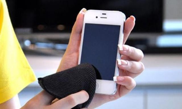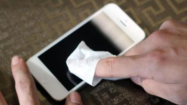 如果手边没有专用清洁液,也可用「精密擦拭布」或「湿纸巾」来擦拭表面,或将水喷洒在布上擦拭,切勿直接将水喷在手机上,这个方法同样适用在手机背面。