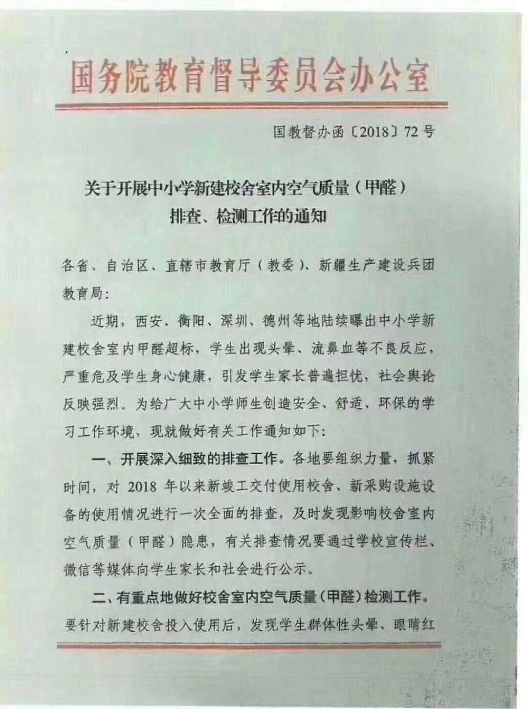 日前,国务院教育督导委员会办公室日前印发了《关于开展中小学新建校舍室内空气质量(甲醛)排查、检测工作的通知》,通报了近期武汉、衡阳、深圳、德州等地陆续曝出中小学新建校舍室内甲醛超标,学生出现头晕、流鼻血等情况。要求各地组织力量、抓紧时间,对2018年新竣工交付使用的校舍、新采购的设施设备进行全面排查,发现影响校舍室内空气质量的隐患。